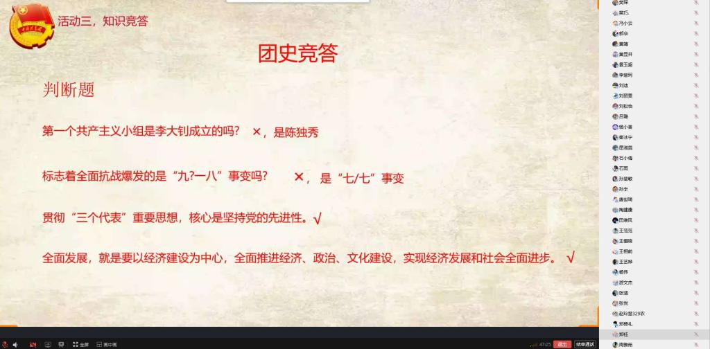 活动最后,团干部就团员知识培训内容进行在线出题,开展“红色信念在心中”共青团知识在线抢答活动。利用在线抢答的方式,不仅活跃了活动的气氛,还进一步加深了每位团员对团知识的认知,使团的相关知识真正的入脑入心。