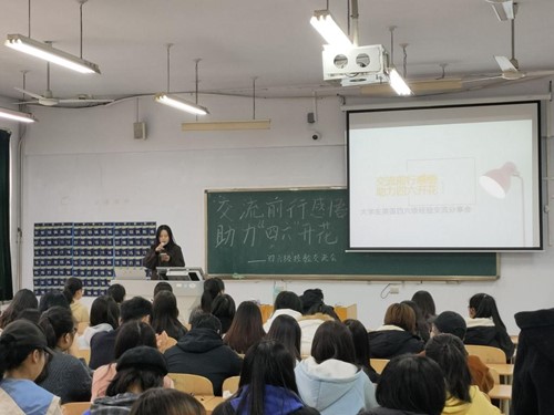 活动伊始,主讲人宣读了举办本次活动的主题、目的及意义,并依次介绍了六名高分通过四六级考试的优秀学生代表。随后由优秀学生代表依次分享自己的备考经验。优秀学生代表们结合自身备考经历向同学们分享了备考技巧和方法。活动过程中,同学们认真听讲、记录。会后同学们纷纷表示获益匪浅并坚定了对英语学习的信心。