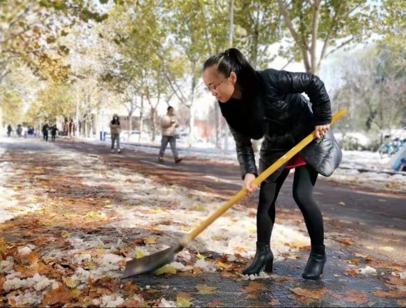 大家无畏严寒,无畏冻得发麻的手指,用铁锹和雪铲将积雪和冰面清扫干净,全身心的给师生群众清扫畅通道路,保障出行安全。路过的师生纷纷投来赞许的目光。经过几个小时的奋战,扫雪除冰任务圆满完成。