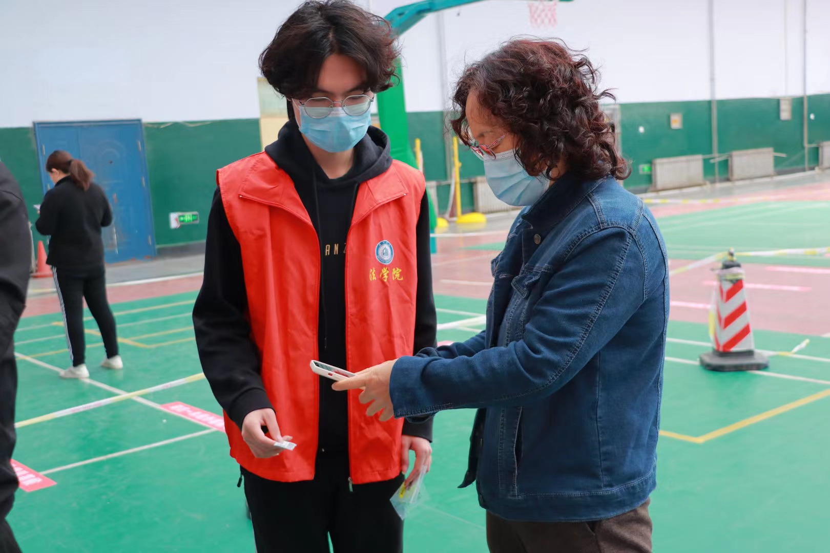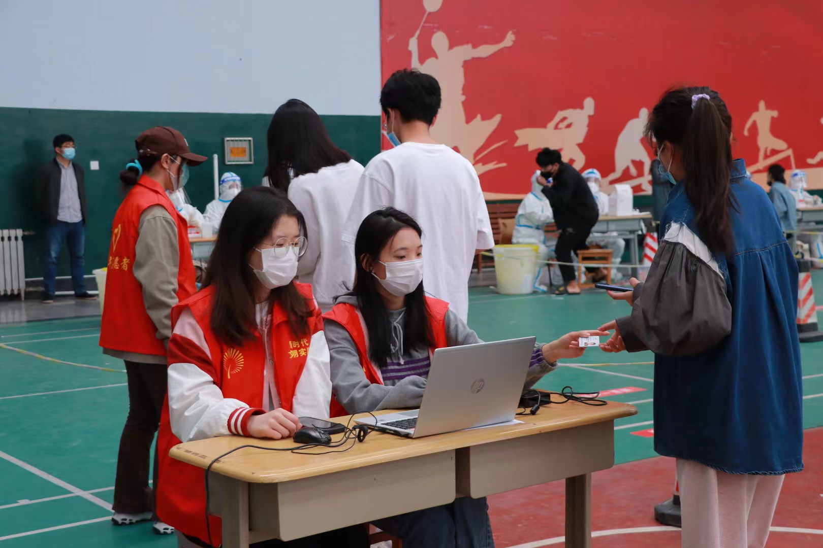 核酸检测分散在三个地点,分别是西校区体育馆、明理楼南、北门。经过前一天的工作部署大会,同学们清晨就穿戴整洁的志愿服和工作牌到达了自己的岗位。志愿者们分工协作,秩序井然,认真完成排队刷身份证、扫描二维码、维持场地秩序、监督等各项工作直至核酸检测结束。