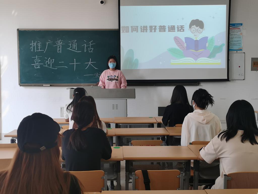 活动伊始,主讲人通过讲述普通话的来源向大家具体介绍了什么是普通话,并通过讲述推广普通话的意义向大家阐明了普通话的重要性。活动过程中,主持人从感受、模仿、养成习惯以及实践四个方面向大家阐释如何讲好普通话,并通过与学生进行互动的方式提高了学生参与的积极性。最后,主讲人向同学们介绍了普通话考试以及考试的一些注意事项,并对本次活动进行总结。
