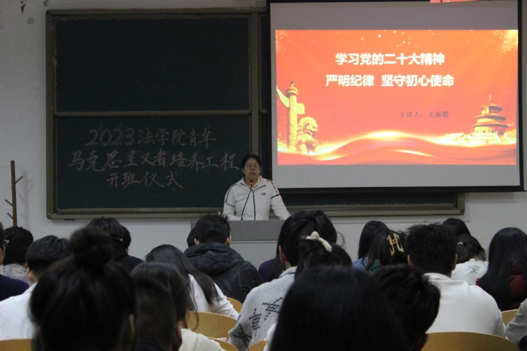 开班仪式结束后,王海霞书记以“学习党的二十大精神严守纪律 坚守初心使命”为题,为青马学员讲授“青马班”第一课。学员们认真聆听,积极互动,进一步加深了对习近平新时代中国特色社会主义思想和党的二十大精神的理解,纷纷表示要在工作和学习中发挥模范带头作用,真诚为同学服务,不忘初心,牢记使命,为社会主义现代化建设、中华民族伟大复兴贡献青春力量。
