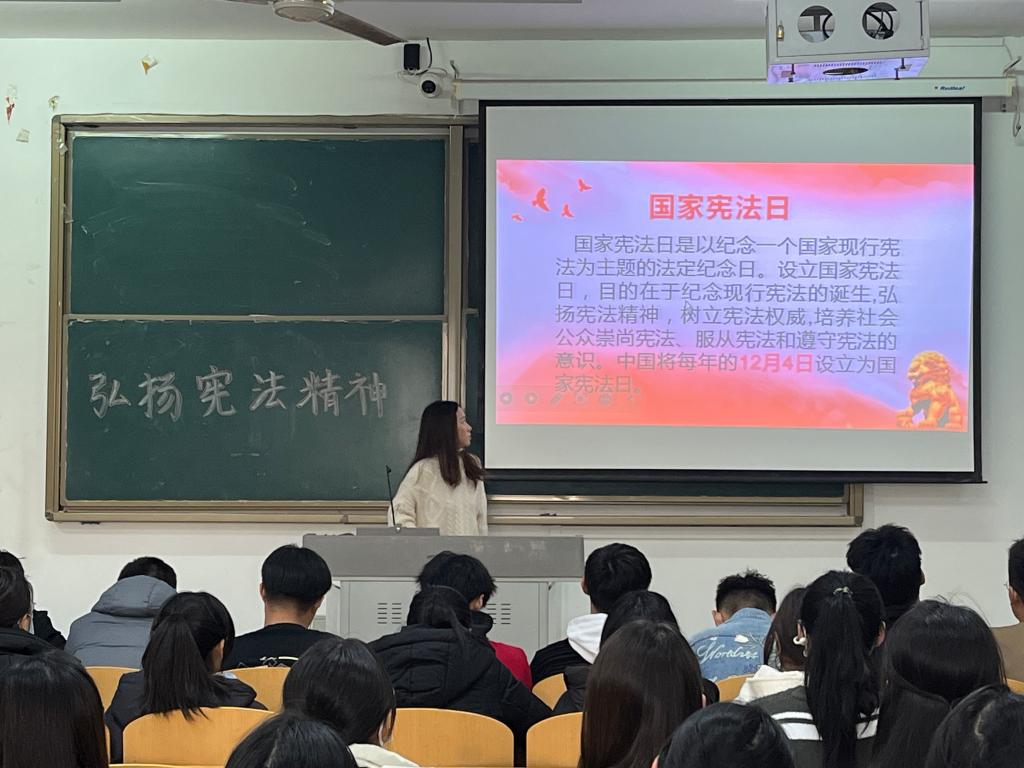 宪法法律宣讲团学生宣讲员,从生活中的宪法别开生面的介绍了宪法的概念、特征、性质及我国宪法的发展历程等内容,通过《什么是宪法》视频赏析,向同学们分享了宪法的重要地位与作用。