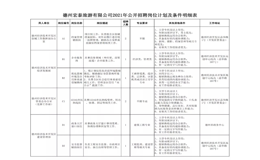 附件1、《德州宏泰旅游有限公司2021年公开招聘岗位计划及条件明细表》下图点击放大