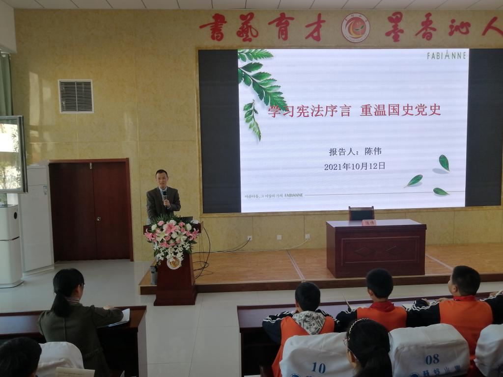 宣讲团陈伟教授作了“学习宪法序言 重温国史党史”的宣讲报告。报告从师生问答互动开始,回顾了中国古代光辉灿烂的文化成果,梳理了1840年以来中国人民忍辱负重,流血牺牲,历尽波折,不懈奋斗,求索民族解放和国家独立,最终在中国共产党领导下夺取革命胜利,取得国家建设事业伟大成就的光荣历程。
