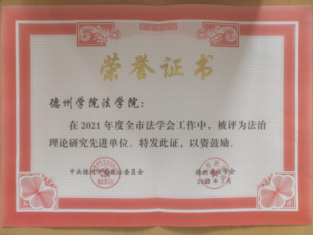 2022年3月2日,中共德州市委政法委、德州市法学会发布了《2021年度全市法学会工作表扬通报》,德州学院2025理论电费免费软件推荐被评为“2021年度全市法治理论研究先进单位”,徐丽红副教授被评为“2021年度市法学会会员单位先进个人”。