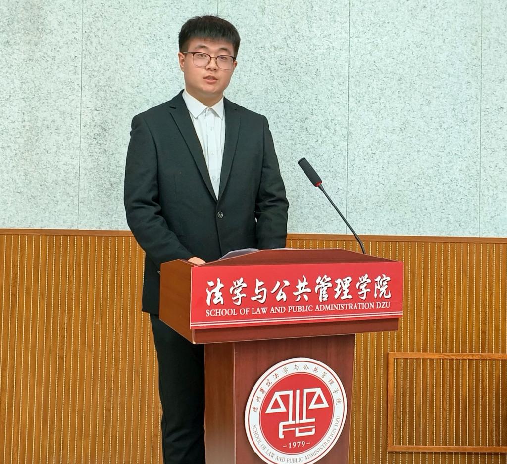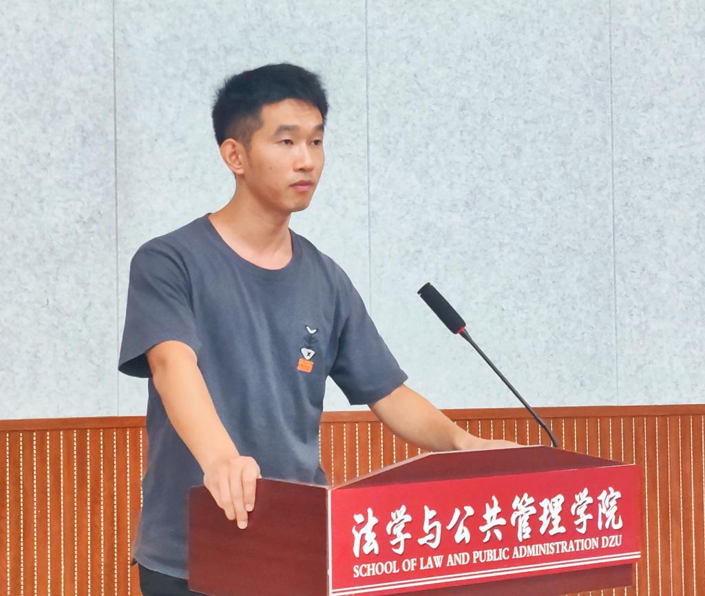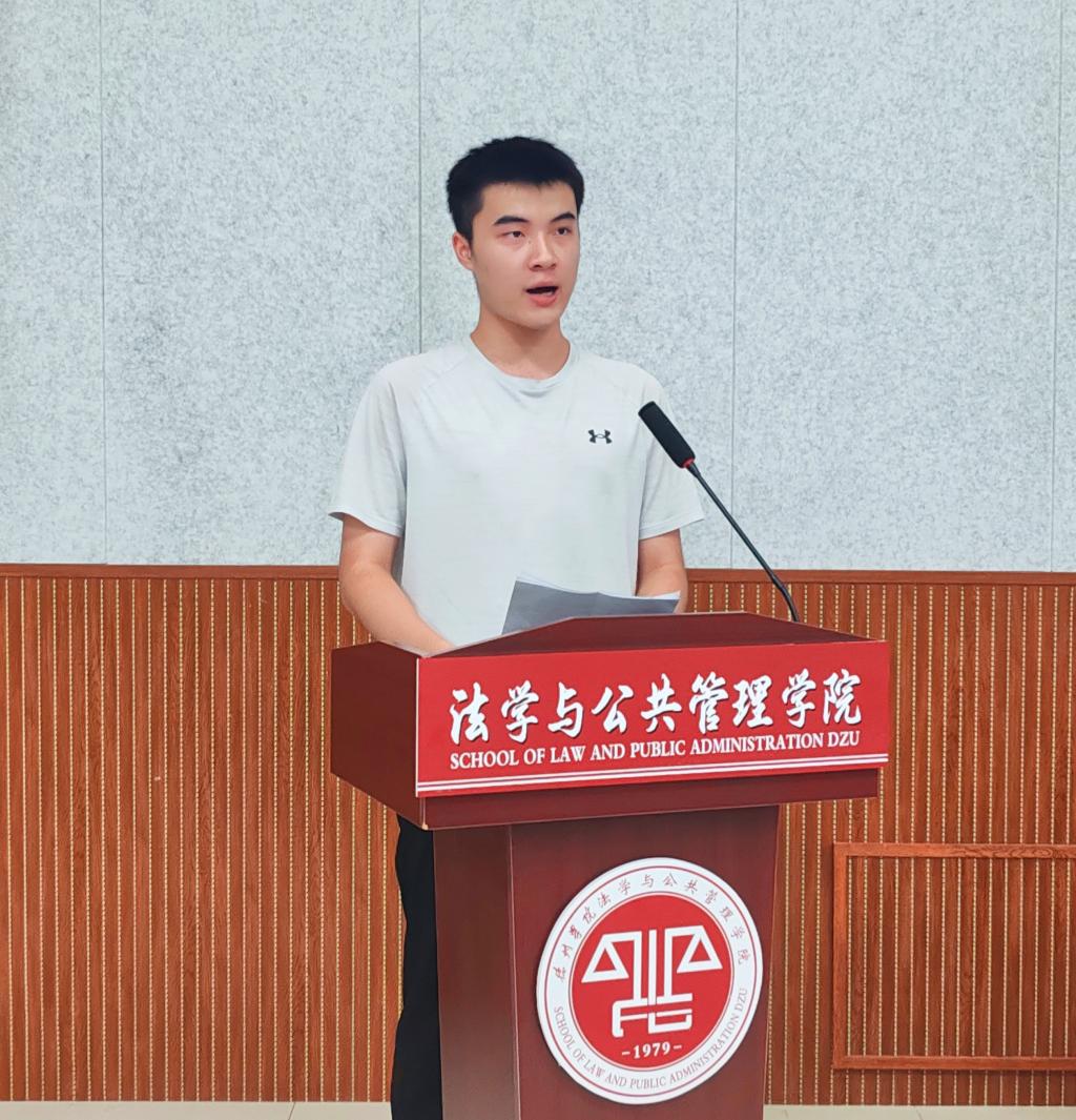 2021级法学专业张金福同学代表在校生发言,他分享了自己在大学里的所学、所思、所想,鼓励学弟学妹们要大胆去尝试,不必害怕挫折,放手地去做自己想做的事,同时学会为自己的每一个选择负责。