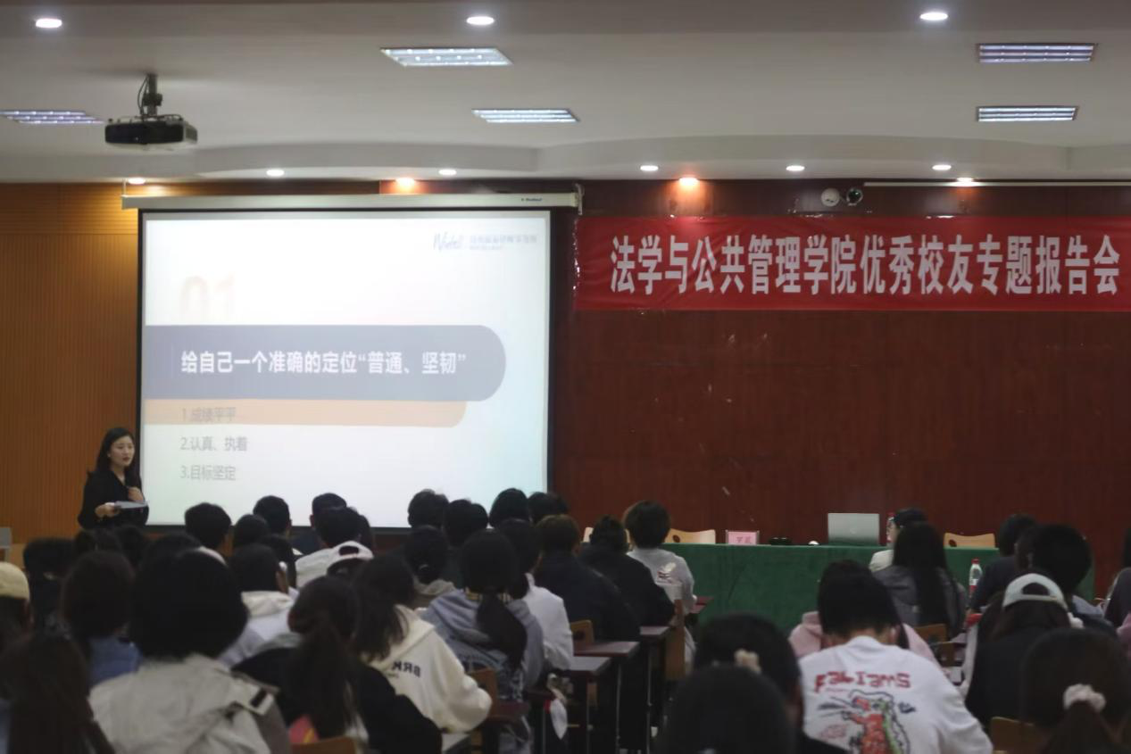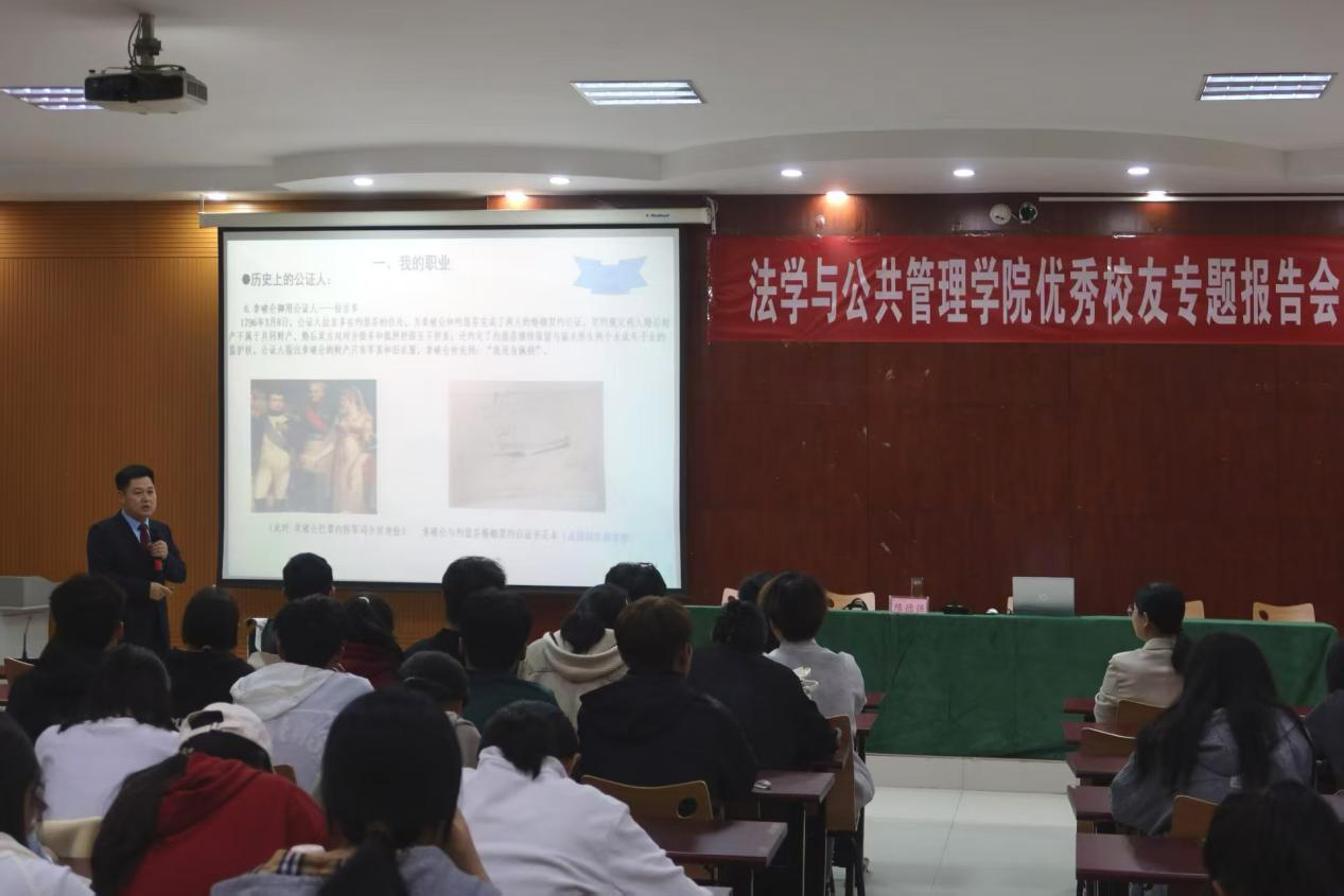 报告会上,陈德强校友以“为做一名合格的法律人而奋斗”为主题展开分享。他凭借在公证领域多年的深厚积淀,详细阐述了公证领域的相关知识,并结合自身丰富的职业经历,向同学们生动展现了公证工作的真实面貌。他鼓励同学们要树立并坚定理想信念,努力学习专业知识,培育法律人思维,以踏实律己铸就理想,用实际行动彰显担当。随后,罗晨校友以亲切且真诚的方式,分享了自己在校期间的学习经历以及工作中的实际案例。她通过一个个鲜活的事例,讲述了自己在求学道路上如何克服困难、不断成长,以及在工作中如何运用专业知识解决复杂问题。这些分享极大地激发了同学们学习专业知识的热情,让同学们深刻认识到专业知识在实际工作中的重要性。在互动环节,同学们积极踊跃,围绕学习和职业规划等方面的问题与困惑向两位校友请教。陈德强和罗晨校友耐心细致地一一解答,现场气氛热烈而融洽。同学们纷纷表示,通过此次报告会,他们对自己的专业有了更深入的了解,对未来的职业发展也有了更明确的规划。