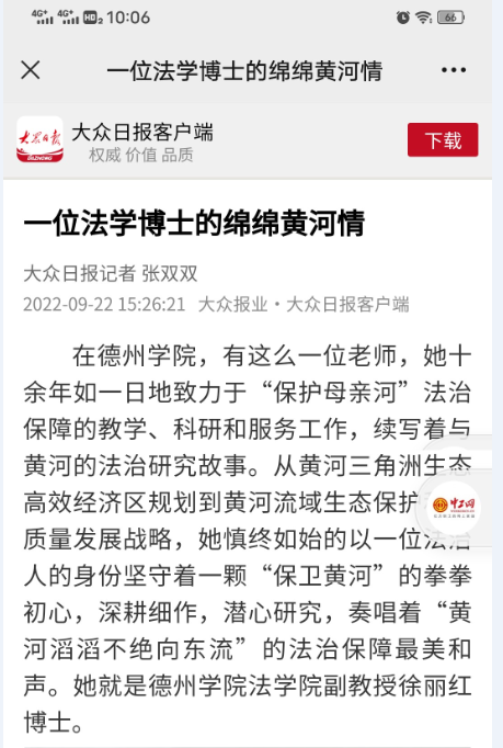 2022年9月22日,《大众日报》刊登了德州学院2025理论电费免费软件推荐徐丽红副教授的事迹文章——《一位法学博士的绵绵黄河情》。对徐丽红副教授数十年持续潜心黄河流域研究给予报道。