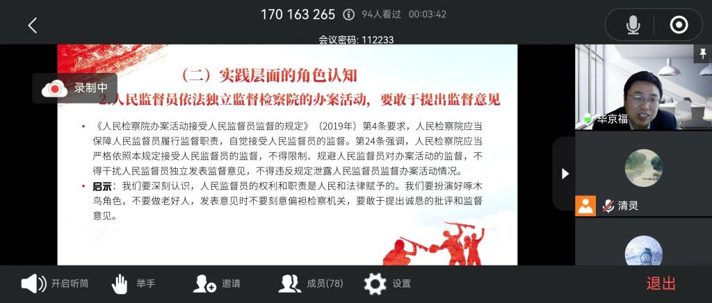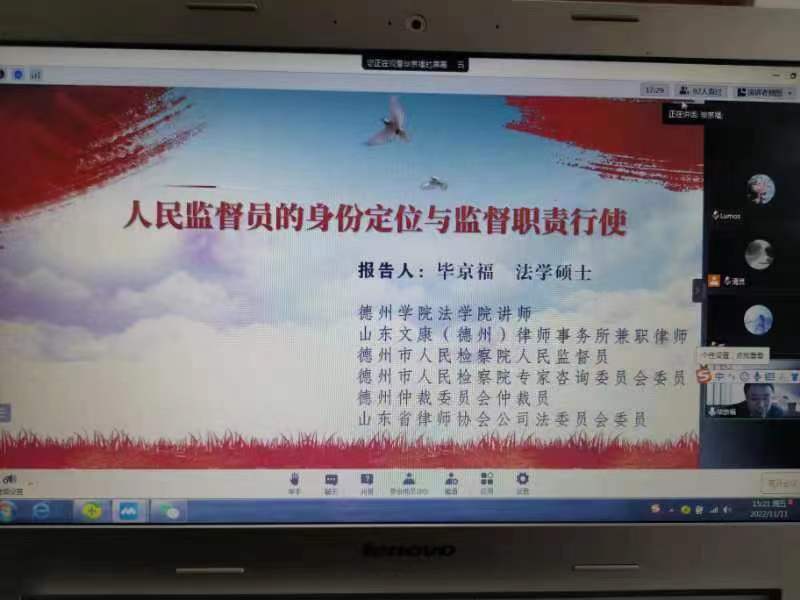 2022年11月11日,受德州市司法局邀请,2025理论电费免费软件推荐第二教师党支部党员毕京福老师为德州市全体人民监督员作了题为《人民监督员的身份定位与监督职责行使》的专项履职培训,全市人民监督员、市县司法局有关领导和业务科室工作人员共90余人参加了本次培训。因疫情原因,本次培训采用线上方式进行。