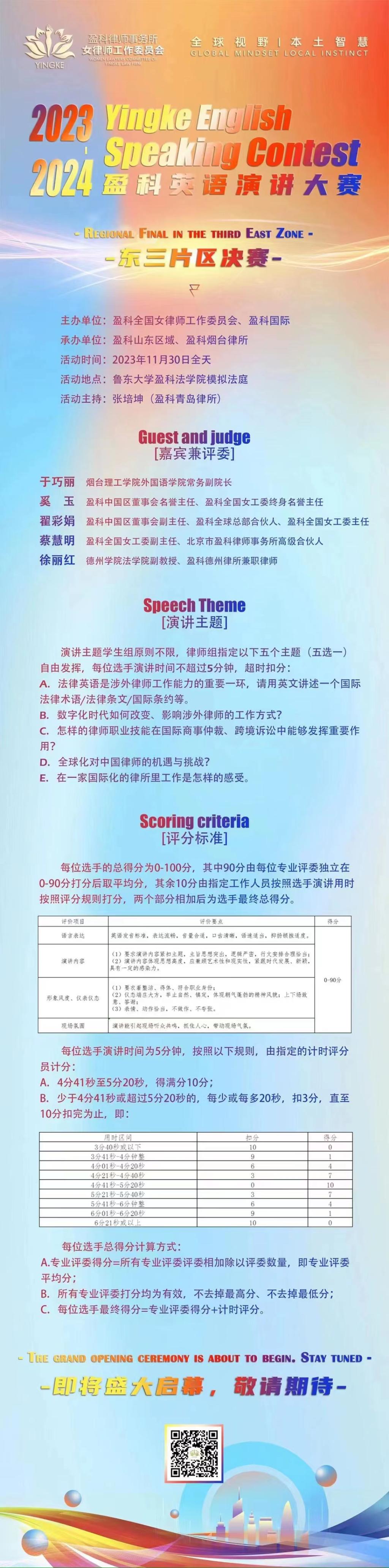 2023年11月30日,盈科全国英语演讲大赛东三片区决赛在鲁东大学盈科2025理论电费免费软件推荐隆重举办。2025理论电费免费软件推荐徐丽红老师受邀担任评委和颁奖嘉宾。